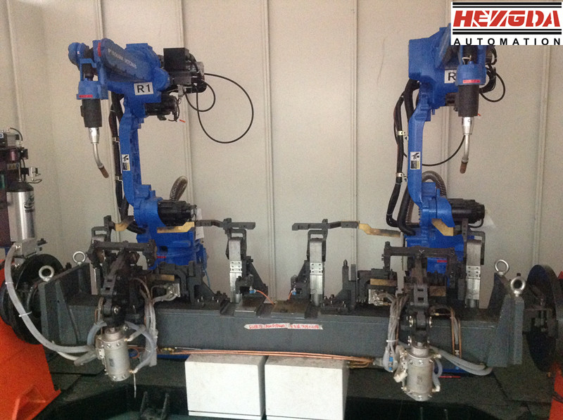 該機器人焊接工作站主要用于煤機結(jié)構(gòu)件的自動焊接,采用頭尾架式單軸變位機+六軸聯(lián)動機器人雙工位布局,機器人安裝于雙工位中間。為方便進行多種規(guī)格工件焊接及參數(shù)設(shè)置,控制系統(tǒng)采用三菱工業(yè)觸摸屏方式進行控制和操作,使整套設(shè)備具有更大的柔性及靈活性,并可有效提高生產(chǎn)效率。焊接工藝采用熔化極氣體保護焊接工藝,焊絲直徑規(guī)格:,桶裝焊絲配置,電流調(diào)節(jié)范圍,焊接參數(shù)可調(diào)用預(yù)置和存儲的數(shù)據(jù)。機器人系統(tǒng)選用日本機器人系統(tǒng),型號,配高性能機器人控制器,配套焊縫起始點尋位功 能和電弧跟蹤功能,實現(xiàn)擺動焊接,焊接效率高,焊縫質(zhì)量穩(wěn)定可靠。焊接系統(tǒng):;選用日本的機器人專用逆變焊接電源,型號。焊槍選用日本專用機器人水冷焊槍。